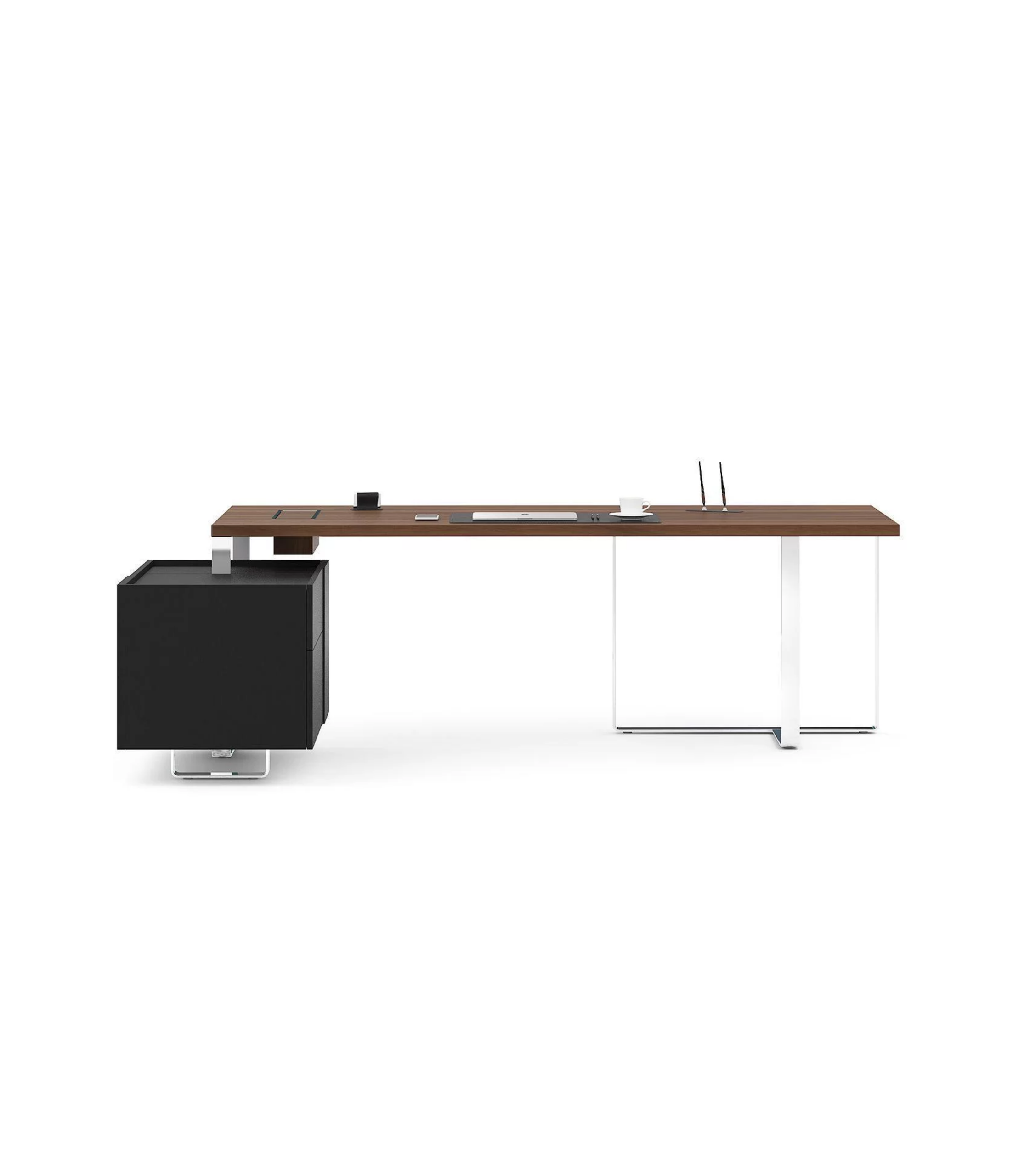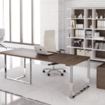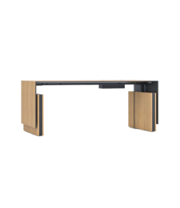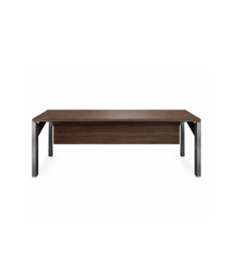 Son plateau épais en mélaminé ou placage bois, associé à un piètement en acier aux lignes épurées, garantit robustesse et esthétisme. Intégrant un système de gestion des câbles avec boîtier électrique, il permet un espace de travail organisé et fonctionnel. Disponible en plusieurs configurations avec caisson ou voile de fond, il s’adapte parfaitement aux besoins des dirigeants