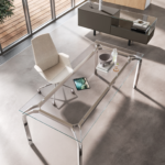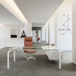 Disponible en finitions verre, bois, mélaminé ou cuir, elle offre une grande liberté de personnalisation pour s’adapter à chaque environnement. Sa structure en aluminium avec pieds fins et détails soignés apporte légèreté visuelle et modernité. Modulable avec différentes configurations et options d’électrification, elle répond parfaitement aux exigences des espaces de direction actuels.