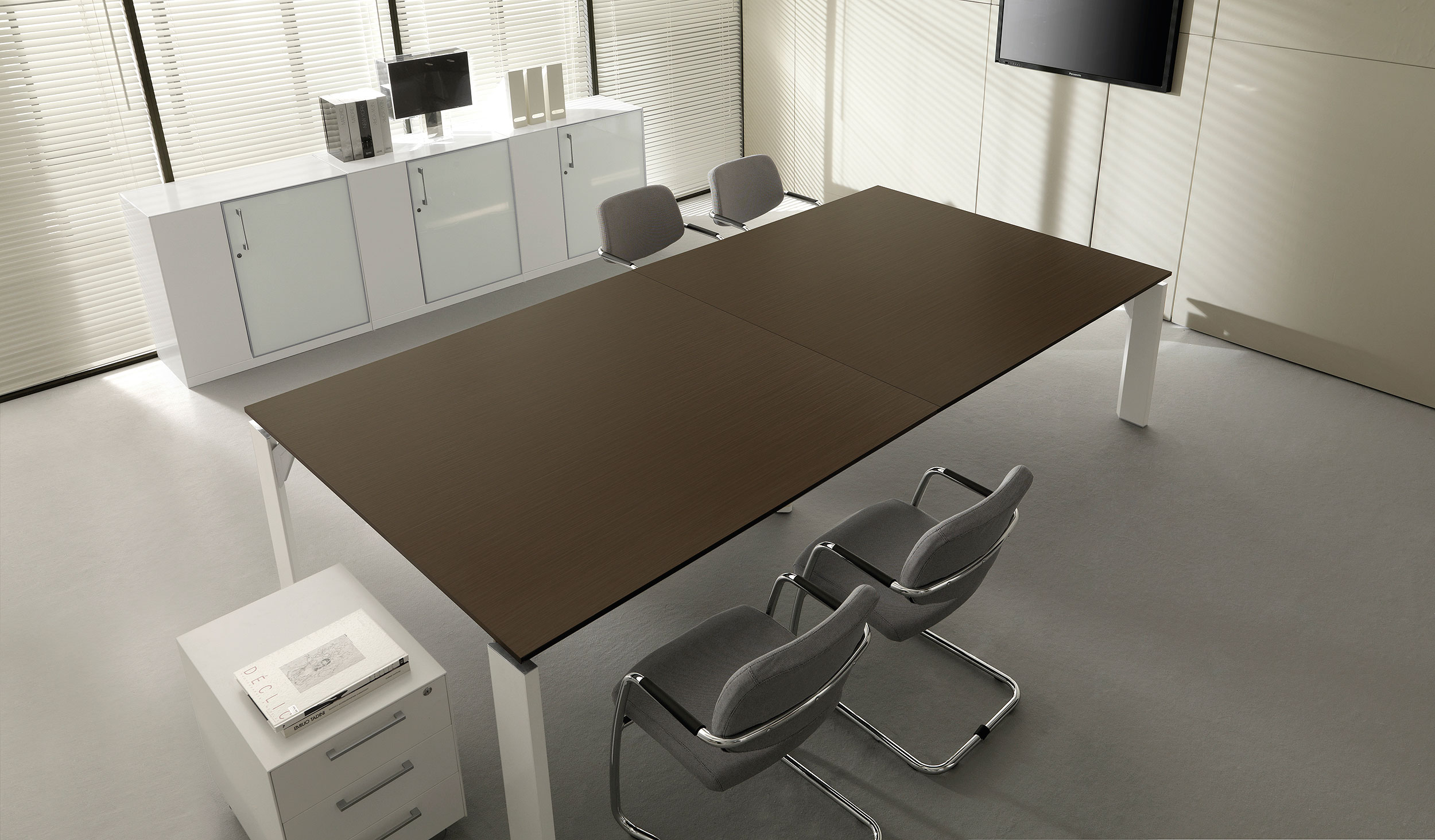 Disponible en plusieurs finitions (mélaminé, bois, verre satiné ou verre extralight), Galio permet de créer des ambiances uniques, du bureau direction au space de réunion haut standing.